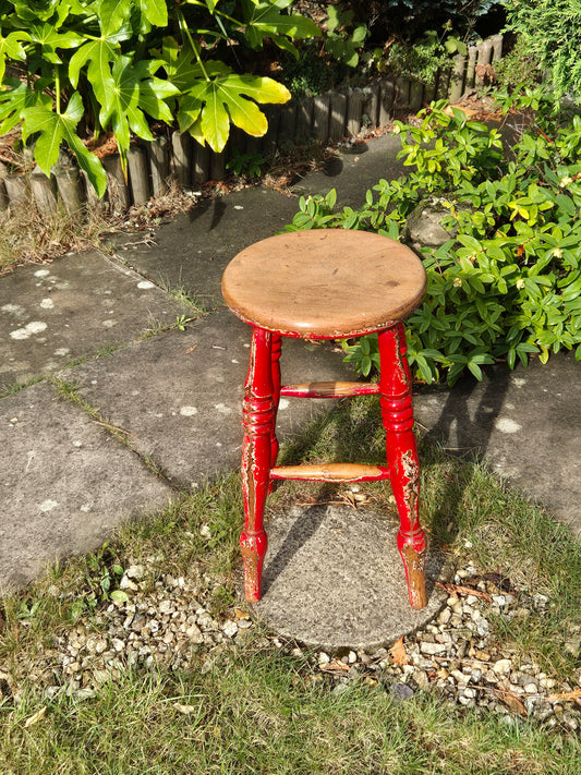 Antique Elm Top Stool Round Top, Turned Legs Country Farmhouse Red