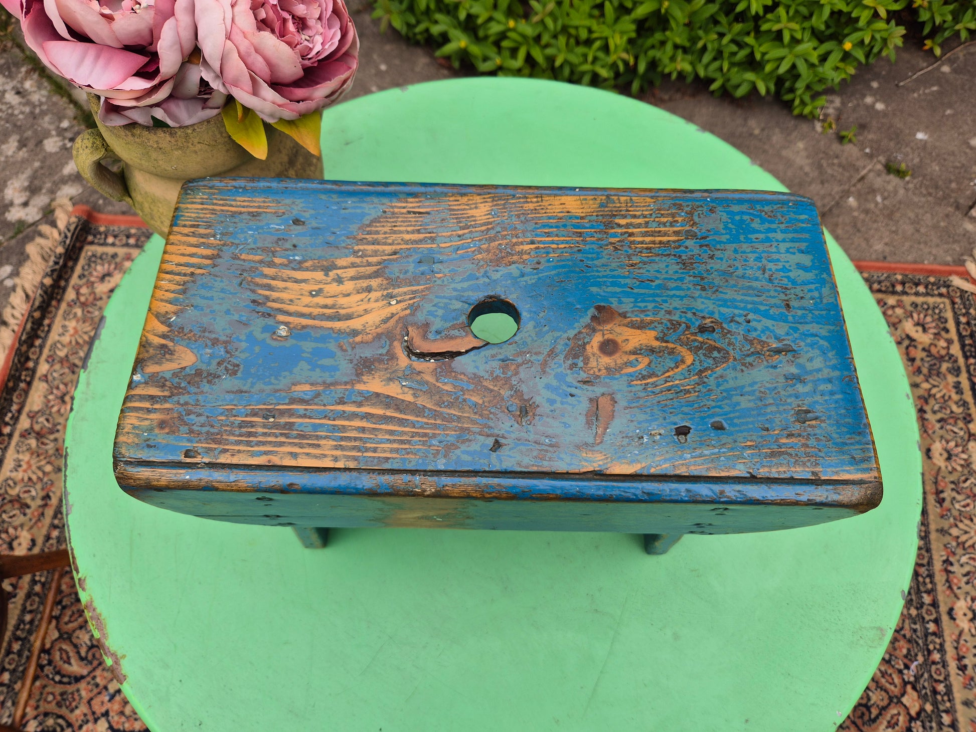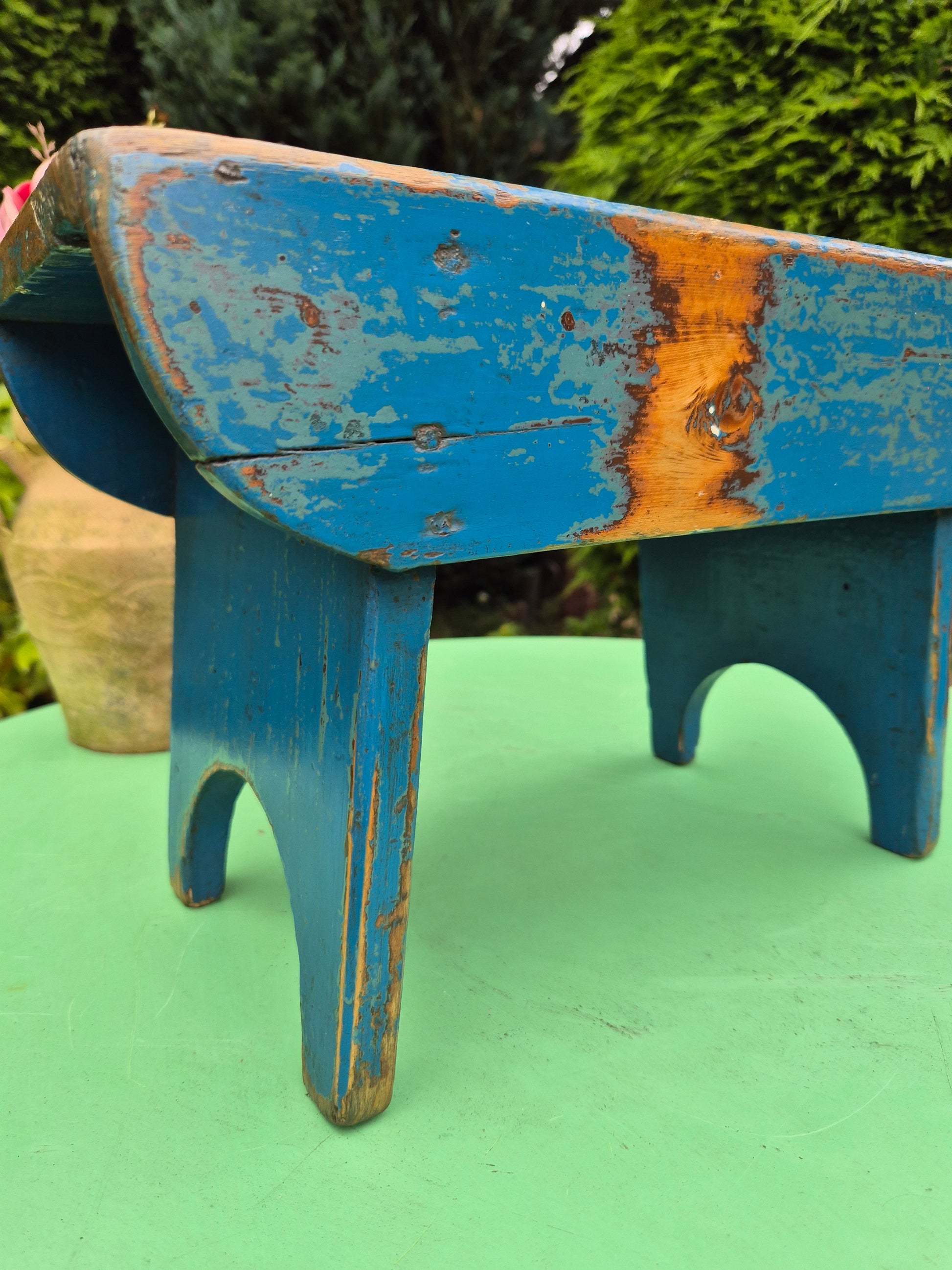 Small rustic stool as shown in the many photos. all marks are shown, coupls of white paint spots all shown. Lovely two tone blue colours again shown in the close ups.