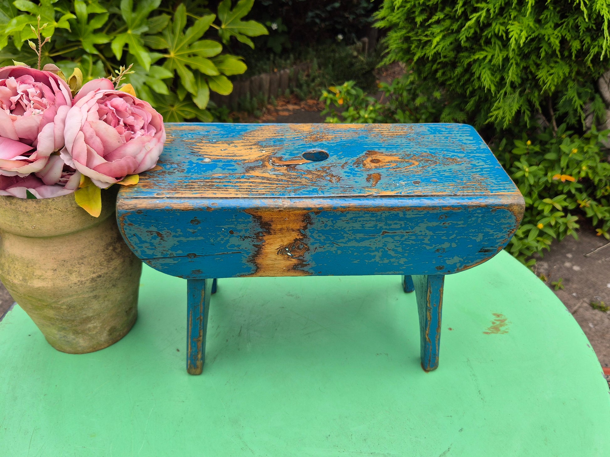 Vintage Rectangular Wooden Stool Rustic Farmhouse Cottage Milking Stool Blue Postage Included