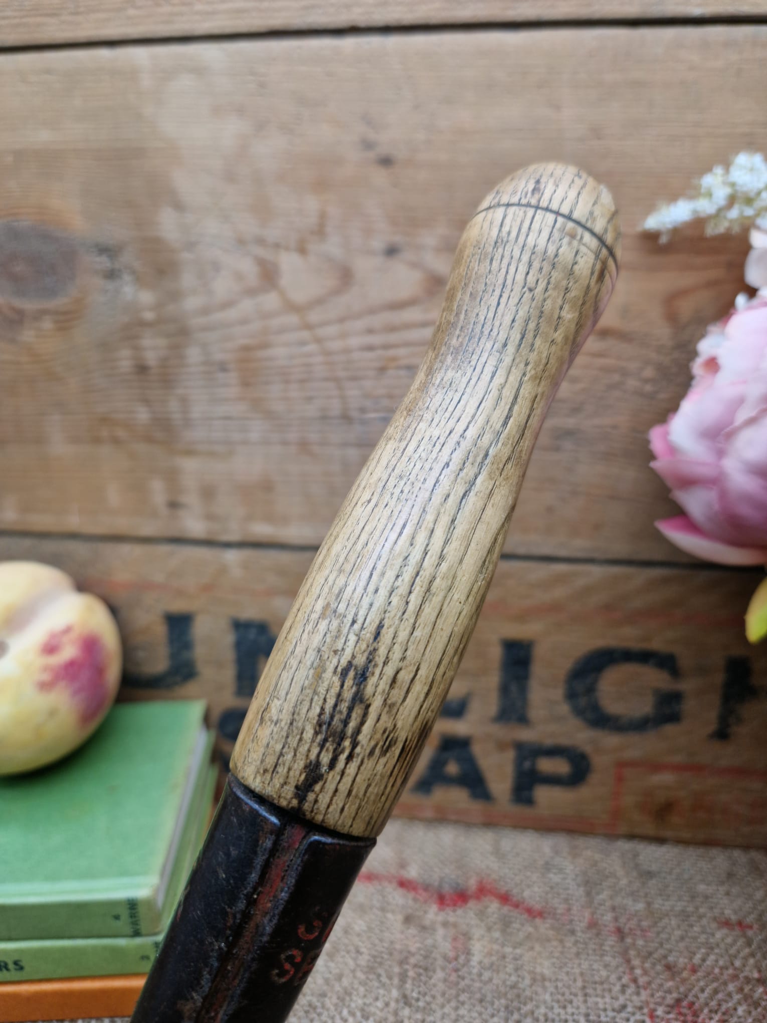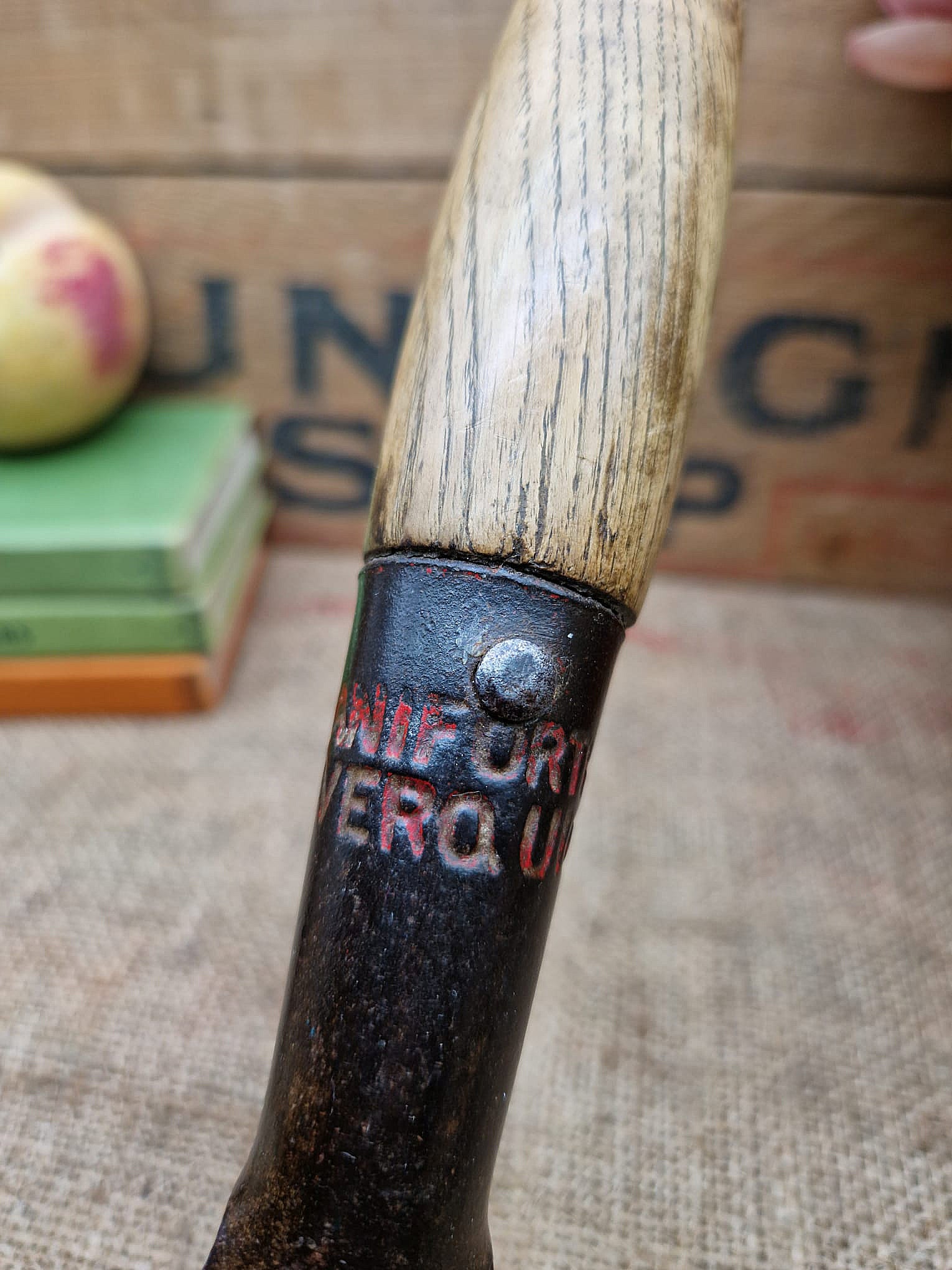 It has a classic shaped tapered ash handle. Embossed marked as shown in the close ups.